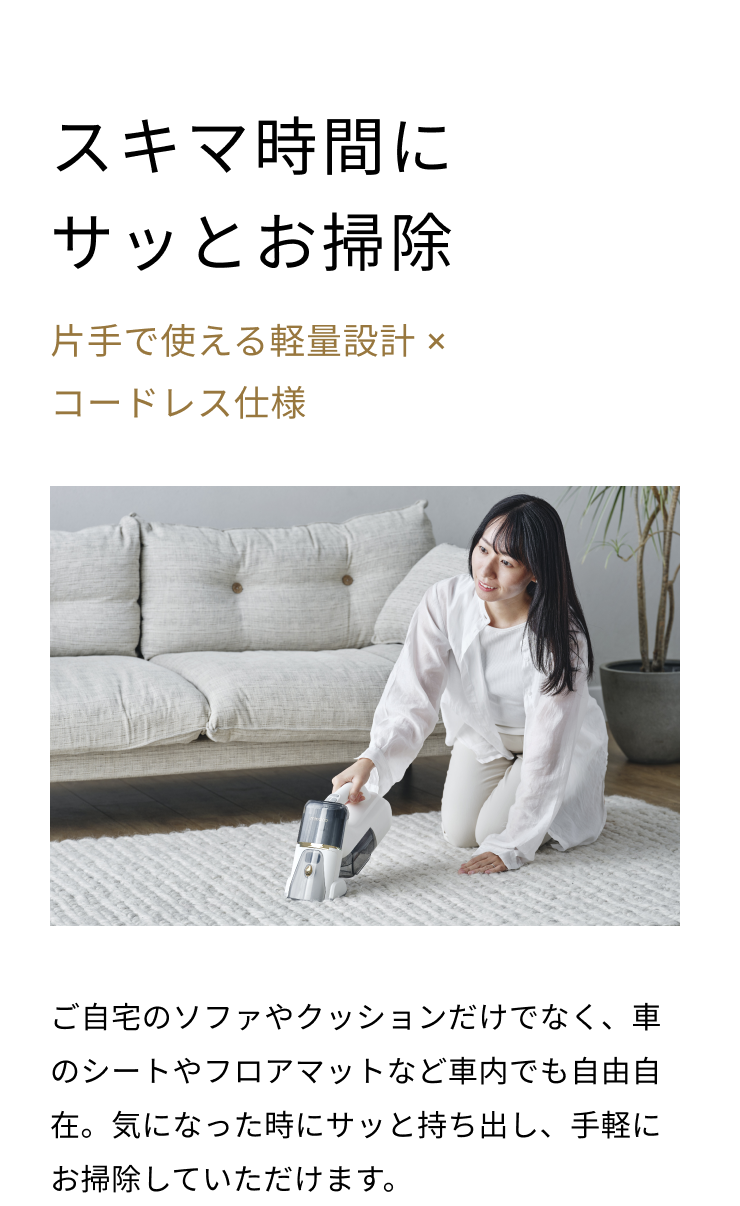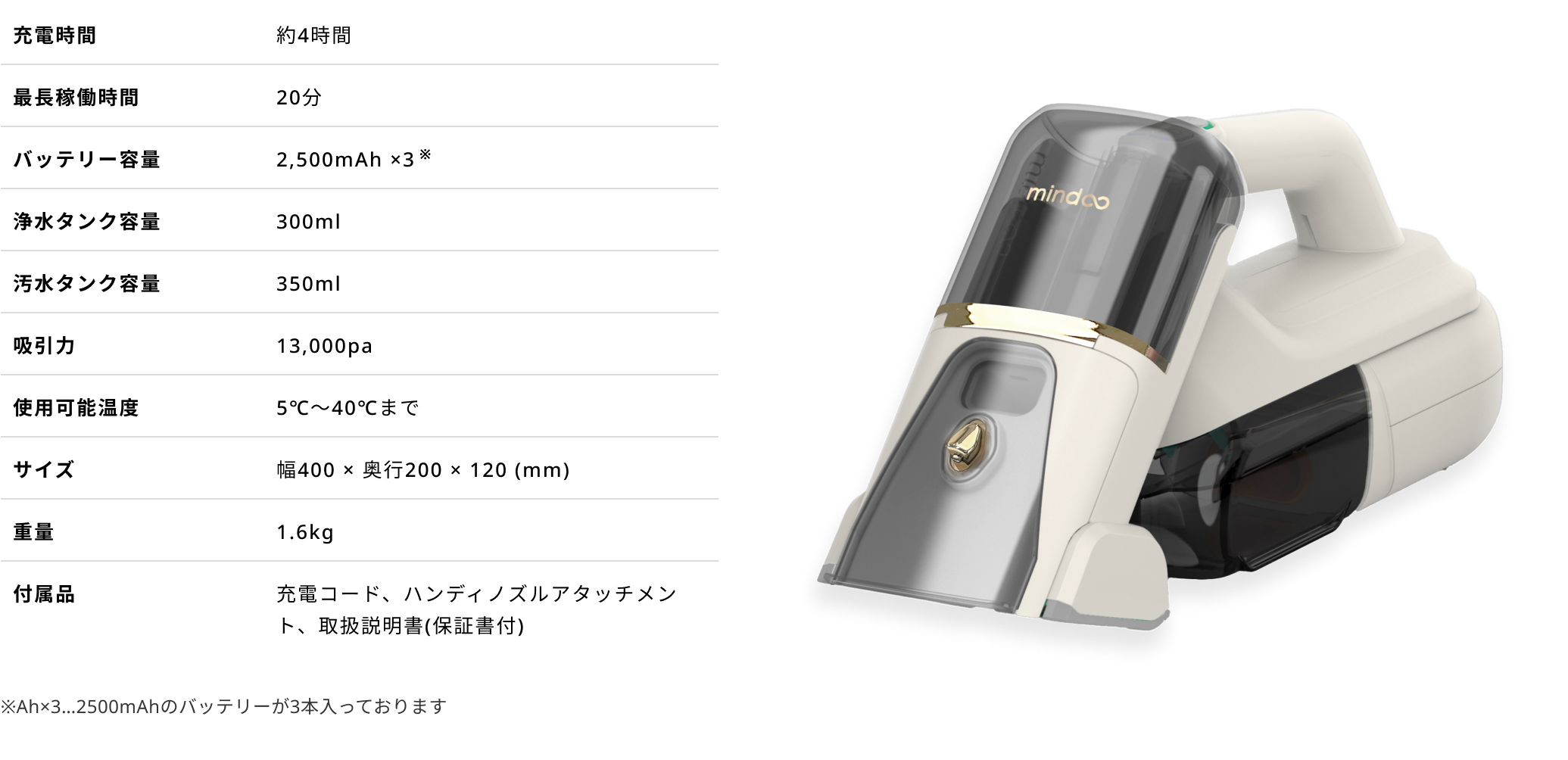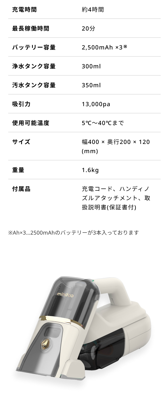 1回の充電で最長20分間の連続使用が可能なので、広範囲の掃除や車内でのご使用でも、強力吸引を維持したまま徹底的に洗浄していただけます。